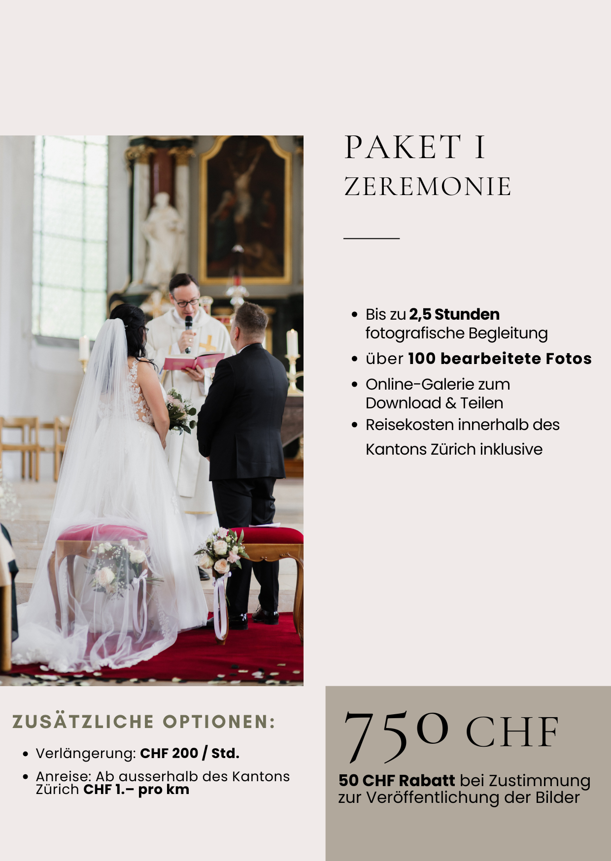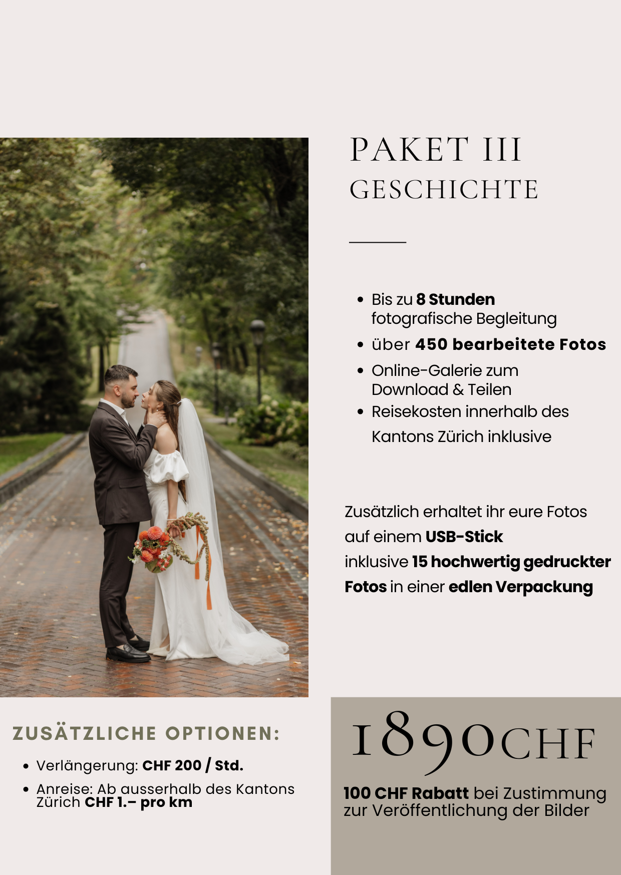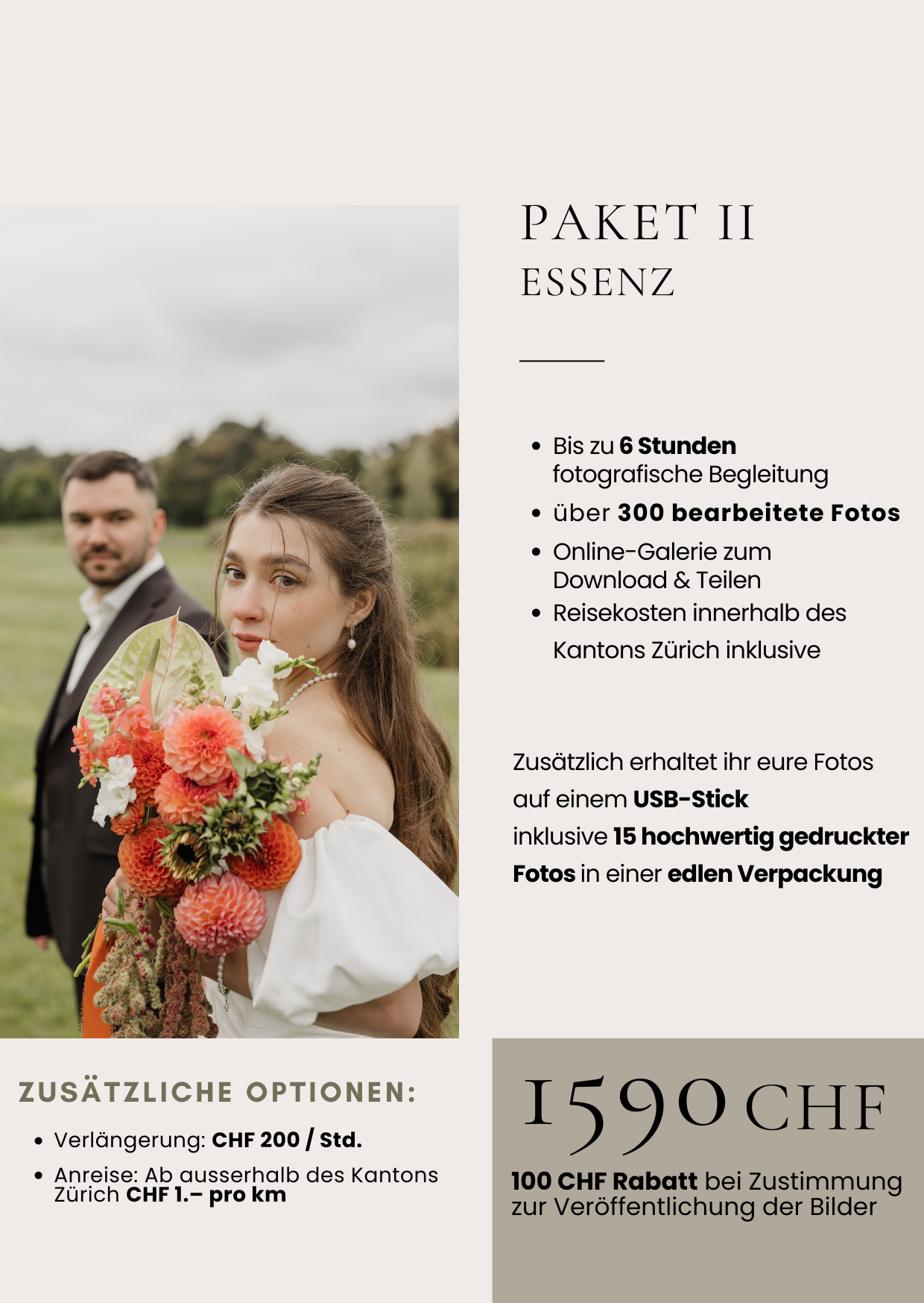 Zur Information: Alle unbearbeiteten Aufnahmen können auf Wunsch gegen einen Aufpreis von 50 CHF bereitgestellt werden. Jedes zusätzliche Foto, das bearbeitet werden soll, kostet 15 CHF.